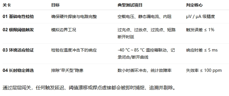 结论:唯有在出厂前对每块保护板进行系统性、模拟极端工况的严格体检,才能为下游应用建立“零隐患”底线。